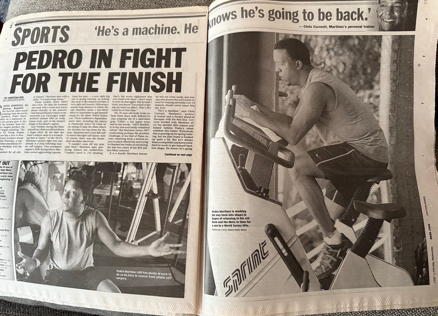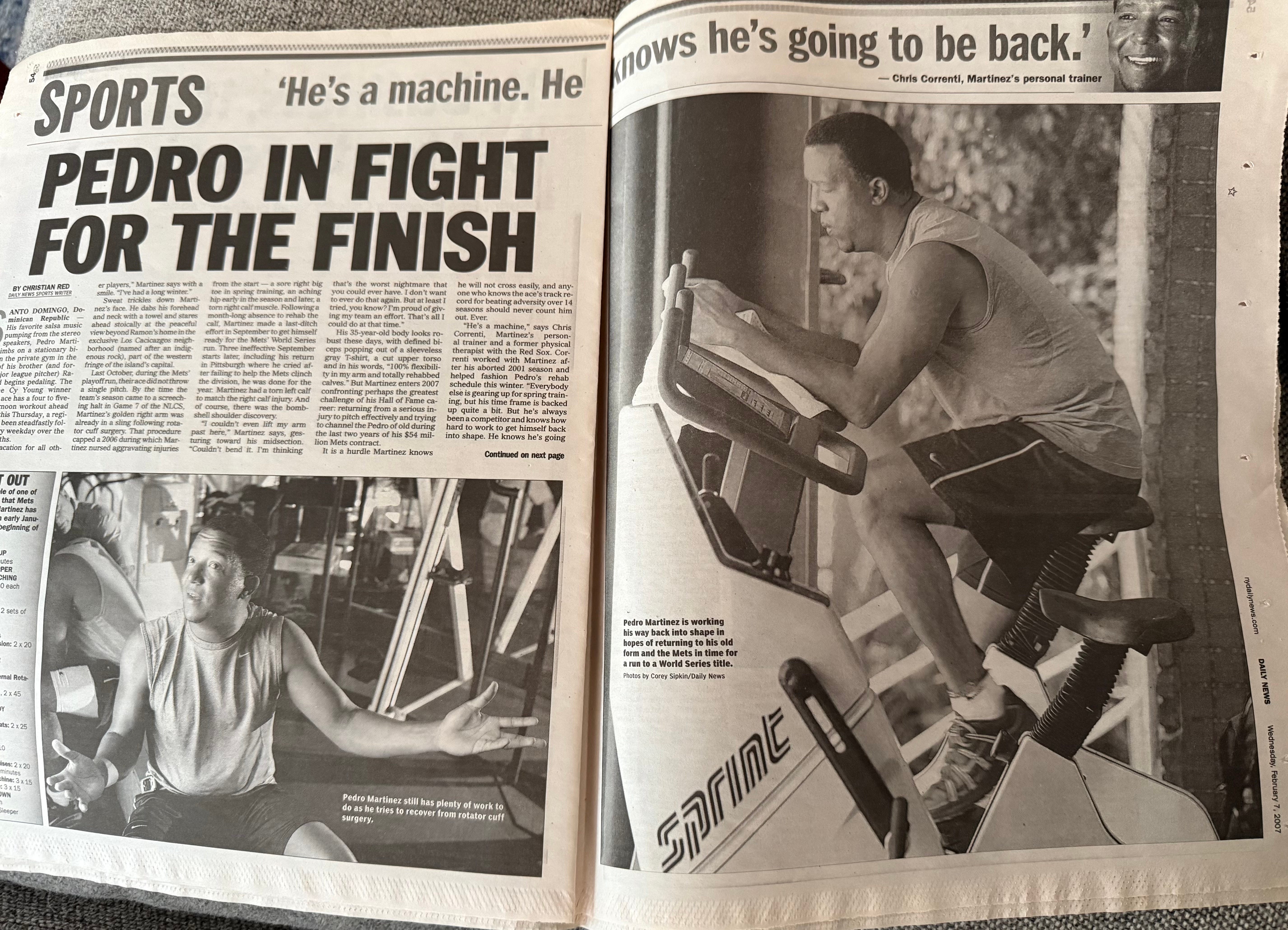 Pedro, dressed in shorts and a sleeveless Nike T-shirt, switched on some salsa music after the handshakes, and for the next couple hours, he hit the stationary bike and lifted weights, dished on his training regimen and rehab, the Mets and how much longer he wanted to pitch. “I’m not going to go over 40,” he said. His wife Carolina stopped by for a visit and chat, and Pedro’s agent, Fern Cuza, also made a cameo, and got in a quick workout himself.
